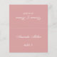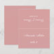 Ett enkelt dammigt rosabrylloppsplatskort med gästens namn och bordnumret tryckt på framsidan och brudens och brudgummens namn och bröllopsdatum tryckt på baksidan (det vill säga den andra halvan, innan vikning). All text är vit kalligrafisk skrift.