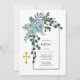 Dammiga blå akvarellblommor och valvformad vår- och sommarinbjudan för pojkar. Denna älskvärda design har en valvformad ram med dammiga blå kaktusblommor och gröna blad i det övre vänstra hörnet och ett guldkors. Frasen "dop" är i scripttypografi.