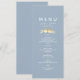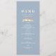 Elegant menykort för bröllop i dammigt blått, med ett par romantiska gyllene älskande fåglar och modern vit serif-teckensnitt. Anpassa med er bröllopsdatum, parets namn och måltidsval. Denna vertikala design är perfekt för att placera på varje gästs tallrik vid ett vår-, sommar- eller tidigt höstbröllop. Kompletterar pastell-, fågel-tema, minimalistisk och naturinspirerad bröllopsdekor. Matchar vackert med matchande inbjudningar, skyltar och brevpapper från samma svit.