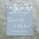Med vackra strängljus och signaturstilsnamn kan denna eleganta dammiga blå välkomstskylt anpassas med din information i chic bokstäver. Designad av Thisisnotme©