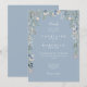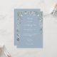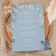 En elegant blommig akvarell bröllopsinbjudan som inramar detaljerna för din bröllopsfest med elegant vit typografi på en stilren dammig blå bakgrund. Designad av Thisisnotme