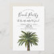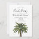En bröllopsstrandfest-inbjudan med en akvarellbild av ett ensamt palmträd vid kusten. Under bilden finns dina unika festdetaljer.