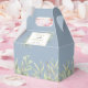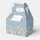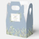 Elegant mjuk grönska blad bröllopsgåva låda med känsliga vattenfärg blad på en dammig blå bakgrund som ramar in era namn och speciella datum i modern typografi. Baksidan har ett tackmeddelande i guldskrift. Ett perfekt sätt att tacka era gäster! Designad av Thisisnotme©
