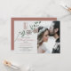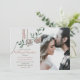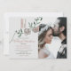Fira din kärlek med denna romantiska och minimalistiska fotobryllopsinbjudan. Med ett anpassat monogram högst upp, mjuka dammiga rosablommor och pastellgrön lövverk balanserar denna modern-boho-design elegans och enkelhet. Ett fotografi i full storlek av paret tillför en personlig, tidlös touch. Perfekt för neutrala, vår- eller pastellfärgade bröllop med en mjuk och stilren estetik. Anpassa enkelt namnen, bröllopsdetaljerna och fotot för att göra det till ditt eget.