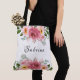 Bär din kärlek och stil med vår förtrollande Dammros | Rosa Blommig Bröllopstaska. Denna vackert tillverkade taska har en delikat arrangemang av dammros och rosa rosor, sammanflätade med frodig grönska. Brudens namn är elegant personifierat i en klassisk kalligrafiskrift, vilket ger en touch av sofistikation och personlig stil.