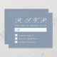 Ett enkelt, minimalistiskt budget-RSVP för ett bröllop. Det har endast vit text på dammsint blå bakgrund. Titeln RSVP och bokstaven M är skrivna i ett elegant kalligrafiskt skript, resten i versaler.