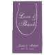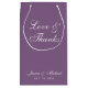 En enkel påsfavorit i tealblå färg. Den har vit text på dammsnott bakgrund. Meddelandet "Kärlek & Tacksamhet" och brudens och brudgummens namn är skrivna med elegant kalligrafi.
