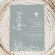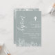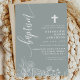 Fira det heliga tillfället för en dop med denna vackra dammiga salvia- och vit blomstereleganta skriptinbjudan. Med invecklad vit blomsterdesign på en mjuk salvia-bakgrund är denna inbjudan perfekt för att inbjuda vänner och familj att delta i detta speciella evenemang. De eleganta blomsterelementen lägger till en touch av naturlig skönhet och grace, vilket gör den idealisk för en sådan meningsfull firande. Anpassa detaljerna för att skapa en unik och minnesvärd inbjudan till ditt barns dop.
