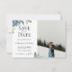 Dammt blå akvarellblommor med trädgårdsbotanisk lövverk, Foto Bröllop Spara datum-kort. Designad för att matcha vår Dammt blå botaniska kollektion.