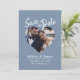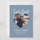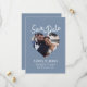 Dammtig blå fotomodern skript spara datum-kort med en centrerad hjärtformad bild, mjuk dammig blå bakgrund och vit skript rubrik. Denna design framhäver ditt förlovningsfoto medan den tydligt presenterar namn, datum och plats i en ren, balanserad layout som känns både modern och tidlös. Perfekt för bröllop, destinationfestligheter, förnyelse av löften eller formella förlovningar där ett klassiskt tryckt meddelande föredras. Lätt att anpassa med dina detaljer.
