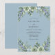 Denna design har en lugn dammig blå bakgrund prydd med frodiga botaniska element. Ljusgröna suckulenter är parade med mjuka lavendelkvistar och silverfärgade eukalyptusblad för att skapa en fredlig, naturlig atmosfär. Den svala färgpaletten är idealisk för ett romantiskt vår- eller vinterevenemang inspirerat av naturen.