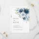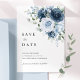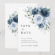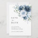 Elegant dammig blå och marinblå akvarellblommig "save-the-date"-kort med raffinerad bukett, klassiska serifdetaljer och en mjuk, romantisk blå palett. Designad för par som vill ha ett graciöst, tidlöst första intryck, blandar denna layout modernt minimalt utrymme med måleriska blommor för en vacker balanserad look.