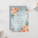 Denna design har en mjuk, eterisk akvarellskylj i dammtorblue som skapar en lugn och drömsk bakgrund. Frodiga persikofärgade peonier och korallrosor är arrangerade i hörnen, åtföljda av ömtåliga gröna ormbunksblad för en naturlig känsla. Den måleriska stilen frammanar en romantisk och sofistikerad stämning, perfekt för en elegant vår- eller sommarhögtid.