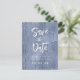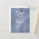 Detta unika moderna kort för att spara datumet har en bakgrundsdesign med dammiga blå impastopinseldrag. Orden "Spara datumet" visas i fet vit handskriven skrift. Anpassa enkelt den vita sans-serif-texten med era namn och bröllopsdatum. På baksidan kan du redigera den anpassningsbara returadressen och ange er bröllopswebbadress för att generera en QR-kod som era gäster kan skanna för att lära sig mer om ert kommande evenemang.
