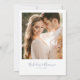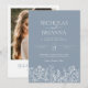 Dammtorrt Blått Minimalistiskt Vildblomma Bröllopsfoto Inbjudan. Personalisera enkelt genom att ersätta varje info. Ladda upp ett vertikalt/stående foto. Se till att kontrollera förhandsgranskningen innan du lägger till i varukorgen. (Exempelbild av Jonathan Borba från Pexels)