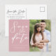 Denna dammiga rosa spara datum för bröllopet postkort inbjudan har er romantiska förlovningsbild med delikat vit typografi för en eftermiddagsceremoni för en feminin brud som gillar mjuka färger och minimal skriptdesign. Mjuka pastellrosa Spara datum postkort.