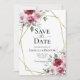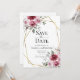 Handmålad akvarell blomsterbröllop spara datum-kort med damros och burgunderfärgade blomsterbuketter med grönska och digital guld folie ram. Du kan anpassa texten, typsnittet, färgen och storleken på framsidan och baksidan av inbjudan. Detta spara datum-kort för bröllop är en del av en komplett bröllopssats med matchande brevpapper.