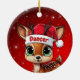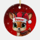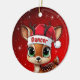 Dancer! Celebrate the holiday season with this festive round ceramic red ornament featuring an endearing woodland forest animal cartoon graphic of a cute baby reindeer wearing a Santa hat. Perfect deer with antlers for decorating your tree or as a thoughtful gift, this whimsical doe decor makes a cherished keepsake for years to come. Customize by changing the text, the font, the font color, or remove the text. You can even transfer this design onto other products. Enjoy this design your way! Check out ForestBabies Xmas Deer Collection for matching decorations. 🎄🩌 Dimensions: Diameter: 2.87". Thickness: 0.156". Weight: 1.4 oz. Made of white porcelain. Full-color, full-bleed printing. Printing on both sides. Thread does not come attached/tied.