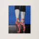 Den här unika, lilla utskriften har lite av en skiss eller en vattenfärgskänsla. Med dansörfötter och ben i rosa, blått och grått hues. Bakgrunden är ett pulserande blått färg med musik noter i skuggorna.