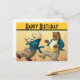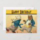 Vintage illustration av två dansbjörnar som bär människokläder. På vykort har guld-remsan överst "Grattis på födelsedagen"
