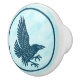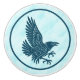 En enkel, blå silhuettliknande bild av en levande korv (Corvus corax) i Norse-Celtic stil, som läggs ovanpå en snöbakgrundsbild.