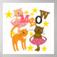 T-tröjor, hoar, mugg, musslor, kort, klistermärken, nyckelkedjor, tote bags, magneter, knappar, kuddar, klockor och annat med tre katter, två i tutus, gult stjärnor och text som lyder MEOW!