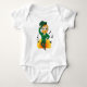 En bodykostym i baby med en förevisning om en leprechaun som leprechaun glatt dansar på grönt kostym, en bockslips och en bowlareare hatt, med svarta anteckningar och en gult och orange i bakgrunden. En perfekt som firar Saint patrick's day!