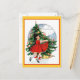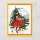 Förtjusande vintagejulkortdesign med en liten flicka i röd dans runt om den dekorerade julgranen. Träd är främre av ett rundafönster.