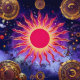 "Dansande brand i Cosmos" Sol. sol hypnotiska svängar och guldljus tänder ge illusionen om rörelse, som om solelflammen lever. Ett imponerande mästerverk som firar energi, värme och selleri balans med färg av rött, orange, gult och blått.