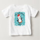 Arktiskt djur tema jul baby T-Shirt har en söt, glad, dansande pingvin som bär en tomtehatt med en bakgrund av vintersnöflingor. Anpassa julhälsningen (visas här med Gläd dig, jord) och barnets namn för en unik present. Perfekt för både pojke och flicka. Originalillustration KL Stock.