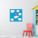 En glad poster med en digital tecknad rosa gris med lite vit vingar, danser på moln som förskönas med hjärtan uppe i det ljusa blå himmel.
