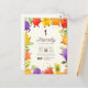 Denna design är en del av samlingen 'Dancing Fruit' för barnkalas. Den har söta brevpapper med akvarell tropiska frukter som papaya, vindruvor, jordgubbar, apelsiner och ananas tillsammans med blad och noter. Perfekt för pojkar eller flickors födelsedagsfirande.