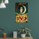 Ett vackert vintage affisch med djävulen, en häxa och en pumpande karaktär som dansar under måne och uggla.