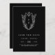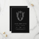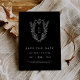 Denna formella mörk svarta klassiska bröllop spara datum från Daphne-insamlingen är en perfekt för ett traditionellt bröllop. Den enkla men sofistikerade utformningen har ett monogram för elegant och tidlös vapensköld av vintage med blommigtar och grön omgivning kring parets initialer.