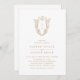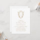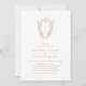 Den här guld-vita, enkla botaniska bröllopsinbjudan från Daphne-samlingen är perfekt för ett traditionellt bröllop. Den enkla men klassiska designen har ett monogram för elegant och tidlös ornerad vapensköld med blommigtar och grön omgivning kring parets initialer.