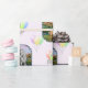 En grått-kvartsto och hennes palominofoal som står i en grönt grassy fält täckt med färgstarka vår-vilda blommor. I bakgrunden är ett stort vackert körsbär träd täckt i rosa blommar och omgivet av blåsande azaleor och rododendroner. Allt på en matchande bakgrund med mönster för pastellernas rosa.