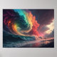 Se på en häpnadsväckande konflikt mellan naturliga krafter i denna mycket inspirerande bild. En kolossal våg, som målas upp i vibrerande regnbåge, stiger mot en dramatisk himmel-ablaze med eländiga orangar, och djupa lila. Havets obearbetade kraft möter den intensiva energin i en stormig solnedgång och skapar en surrealistisk och fängslande scen. Tiny figurer vid kustlinjen understryker inslag enorma och lämnar tittarna med en känsla av och ren naturkraft.