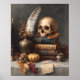 A moody and atmospheric still life painting featuring a human skull resting atop a stack of antique books. Surrounded by dried leaves, a black candle, aged parchment, a striped feather, and a small gourd, this gothic composition captures the essence of dark academia and autumnal mystique. Perfect for lovers of vintage decor, scholarly aesthetics, and macabre beauty.