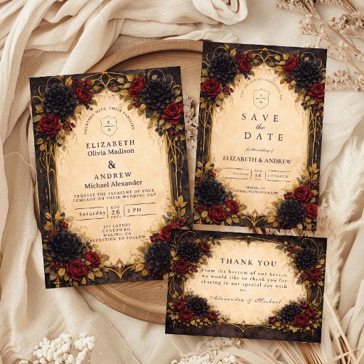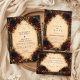 A bold and dramatic design inspired by gothic romance and baroque opulence, featuring deep crimson roses, black dahlias, and rich golden foliage woven into an ornate antique frame. The warm parchment center glows against the dark, moody background, creating a striking contrast that feels both luxurious and timeless. Intricate details and layered florals add depth and intensity, making this design perfect for an unforgettable evening celebration filled with elegance, mystery, and old-world charm.