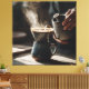 Thick aromatic steam billows upward as a steady stream of hot water pours from a hand-thrown ceramic kettle into a ribbed dripper perched on a matching stoneware mug. Deep blue-black glaze catches warm side light, revealing every textured imperfection and handmade beauty of the pottery. This intimate slow-brew moment captures the quiet joy of mindful coffee making, perfect for kitchen wall art, canvas prints, mugs, aprons, mousepads, tea towels, and décor that honors the simple ritual of a perfect cup.