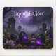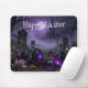 A mysterious Easter scene set in a foggy graveyard with glowing purple eggs and a gothic cathedral in the background. Dark tones, misty atmosphere and eerie lighting create a unique, haunting twist on traditional Easter imagery.