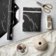Bold dark aesthetic wrapping paper featuring abstract curved shapes, subtle stars, and soft gold accents on a matte black background.