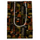 Sophisticated mid-century geometric pattern gift bag featuring layered circles, arches, triangles, and rectangles in forest green, burnt orange, ochre, and cream on a black background. Rich textures and retro-modern shapes create a bold design ideal for Bauhaus lovers, vintage décor fans, and anyone drawn to moody modern style.