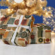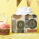 Sophisticated mid-century geometric pattern wrapping paper featuring layered circles, arches, triangles, and rectangles in forest green, burnt orange, ochre, and cream on a black background. Rich textures and retro-modern shapes create a bold design ideal for Bauhaus lovers, vintage décor fans, and anyone drawn to moody modern style.