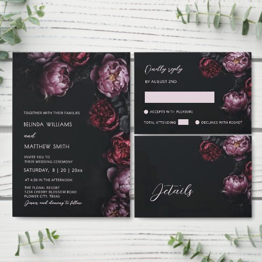 This elegant dark moody floral wedding invitation features purple and red peony flowers on a black background. Dark romantic aesthetic wedding invitation.