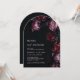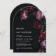 This elegant dark moody floral wedding invitation features purple and red peony flowers on a black background. Dark romantic aesthetic wedding invitation.