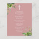 Detta eleganta eukalyptusgrönska botaniska dammiga rosa dopinbjudningskort kan anpassas med din information i chic typografi med monograminitialer på baksidan. Designad av Thisisnotme©