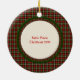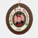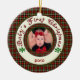 Baby första prydnad för foto för julpersonlig i röd och grön helgdagpläd. Perfekt helgdaggåva eller strumpastuffer för familj och vänner! Skräddarsy den med ditt barns namn och datera på baksida.