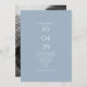 En modern, minimalistisk utformning med speciella datum och bröllop-detaljer som finns i klassisk, chic-typografi på en dammig blå bakgrund. Lägg till ditt favoritfoto på andra sidan. Designad av Thisisnotme©