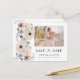 Modern botanisk Blommigt Foto sparar datumvykortet. Lägg märke till din stora dag med tidlös elegans med det här fotovykortet som är sparan i tiden. Med ditt favoritfoto inramat av handmålade vattenfärgade blommigtar i krämt elfenben, sage grönt, burgundy och dammblått kombineras personlig charm med boho-inspirerad sofistikering. Postkortets baksida innehåller ett samordnat blommönster som garanterar en sammanhängande och polerad utformning. Perfekten för vår och sommar-bröllop, det här spara-till-datum-kortet anger tonen för firande och skapar uppståndelse bland dina gäster.